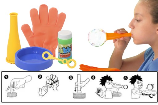 Wystarczy nałożyć rękawiczkę, a do załączonego pojemnika wlać płyn i zanurzyć w nim rurkę, następnie wydmuchać bańkę mydlaną.