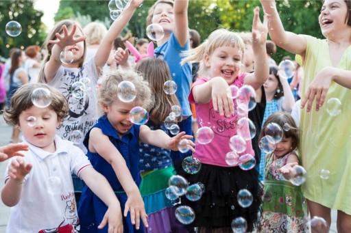 - Aktywność fizyczna: Bieganie, skakanie i łapanie bąbelków zachęca do ruchu.
