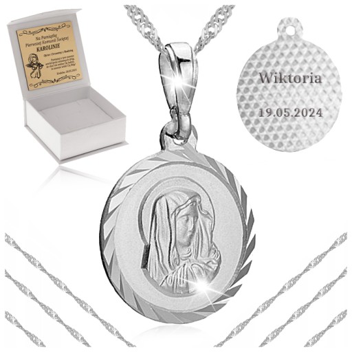 SREBRNY ŁAŃCUSZEK SINGAPUR + MEDALIK PASYJKA 925 MATKA BOSKA MADONNA GRAWER Okazja chrzest/komunia