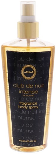 Mgiełka do ciała Armaf Club De Nuit Intense Woman to damski, szyprowo-kwiatowy zapach, który z pewnością przypadnie do gustu miłośniczkom intensywnych i nieco orientalnych kompozycji. Całość bowiem to bogata mieszanka, w której pierwsze skrzypce gra mroczna, krwistoczerwona róża otulona wianuszkiem z liści paczuli i dymem drewna agarowego.