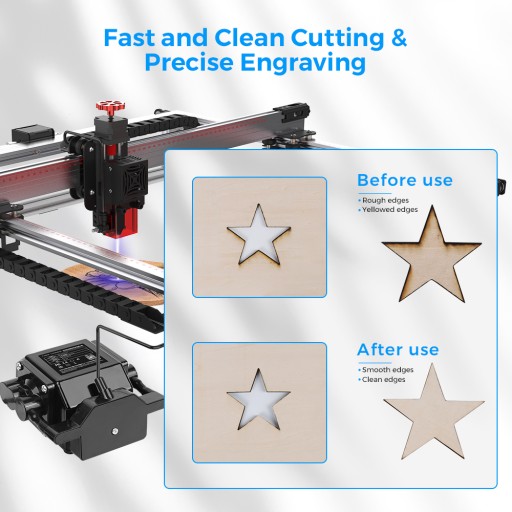Zaawansowana technologia laserowa: Moduł laserowy TTS-55 PRO wykorzystuje najnowszą technologię punktu kompresji LD+FAC+C-Lens, stałą ostrość, długość ogniskowej wynosi tylko 23 mm, w porównaniu z innymi laserami o długim ogniskowaniu, laser o krótkim ogniskowaniu ma silniejsze możliwości grawerowania i cięcia. Dokładność grawerowania: 0,1 mm.
