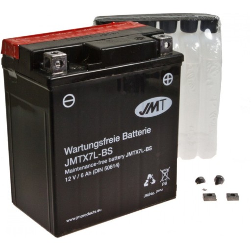 Akumulator dostarczany z zasobnikiem elektrolitu. Nie został on aktywowany i po zalaniu go elektrolitem należy go doładować według wskazań opisanych poniżej. Na przestrzeni ostatnich kilku lat akumulatory JMT zmieniły całkowicie swoje oblicze. Poprzez zastosowanie całkowicie zautomatyzowanej linii produkcyjnej, obecnie produkowane akumulatory JMT reprezentują najwyższy światowy poziom technologiczny. Relatywnie niska cena powoduje, iż akumulatory JMT są najlepszym na rynku rozwiązaniem dla motocyklistów. OSIEM ZASAD PRAWIDŁOWEJ EKSPLOATACJI AKUMULATORA: 1. Nowy akumulator zalej elektrolitem 2. Utrzymuj akumulator w czystości 3. Klemy akumulatora zabezpiecz wazeliną techniczną 4. Kontroluj poziom elektrolitu 5. Uzupełniaj ewentualne niedobory wodą destylowaną 6. W zimie odłącz akumulator od instalacji motocykla 7. Przechowuj go wówczas w chłodnym, ale suchym pomieszczeniu 8. W razie potrzeby doładuj "małym prądem". UWAGA! Średnio, co drugi akumulator, który po okresie zimowym nie nadaje się do dalszej eksploatacji jest uszkodzony z powodu niewłaściwego przechowywania. Użyj aerometru (numer katalogowy 720 0666) celem sprawdzenia gęstości elektrolitu w akumulatorze. Gdy gęstość wynosi 1,20 kg/l lub mniej - akumulator wymaga ładowania. Stopień naładowania można sprawdzić alternatywnie miernikiem napięcia. Jeżeli wynosi ono 6,1V (bateria 6V) lub 12,2V (bateria 12V) należy akumulator doładować prądem równym lub mniejszym niż 1/10 pojemności akumulatora. Przykład: baterię 8Ah należy ładować prądem o wartości 0,8 A.