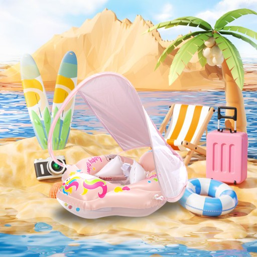 Pływak dla niemowląt z baldachimem i „antypoślizgowym ogonem”, dwuwarstwową komorą powietrzną i miękkim podparciem dna ułatwiającym nauczanie nauki pływania.