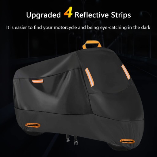 4 paski odblaskowe i uchwyty pasa: Ta plandeka na motocykl ma 4 dobrze widoczne paski odblaskowe, 2 z przodu i 2 z tyłu. Dzięki temu można łatwiej znaleźć swój motocykl i przyciągać wzrok w ciemności. Górna część jest wyposażona w uchwyt paska.