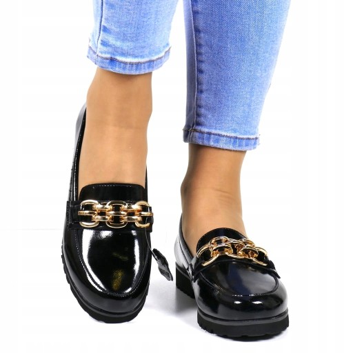ELEGANCKIE WIOSENNE PÓŁBUTY CZARNE ZE ZŁOTYM ŁAŃCUCHEM LAKIEROWANE MOKASYNY WYGODNE
