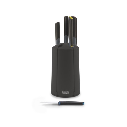 Dlatego marka Joseph Joseph proponuje zestaw z kolekcji Elevate: komplet 5 noży w obrotowym stojaku. Całość w nowoczesnej formie oraz uniwersalnym, pasującym do każdego wnętrza czarnym kolorze.