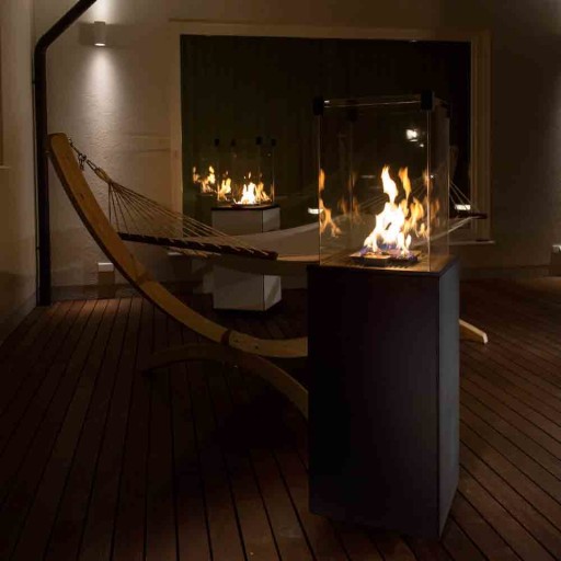 PATIO zasilane jest płynnym gazem z butli, która ukryta jest w obudowie. Płomienie są zamknięte w szklanej komorze, która osłania nas przed bezpośrednim kontaktem z ogniem. Pozwala to na podziwianie gry płomieni będących pod całkowitą kontrolą. Dolna część obudowy urządzenia została wykonana ze stali, osłoniętej z trzech stron szklanymi panelami w kolorze czarnym. Dzięki temu Patio jest odporne na uszkodzenia. W urządzeniu zastosowano szkło hartowane o grubości 4 mm.