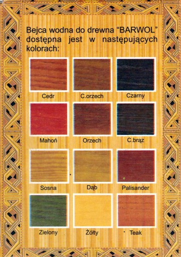 Dostępna jest 11 kolorów: ciemny brąz, ciemny orzech, czarny, dąb, mahoń, orzech, palisander, sosna, teak, zielony, żółty