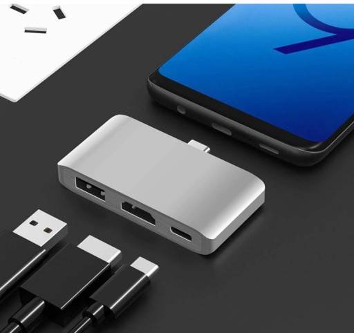 Do urządzenia z wejściem USB-C 3.1 podłączamy adapter. Bez konieczności instalowania jakichkolwiek sterowników możemy korzystać z USB 3.0 podłączając mysz/klawiature lub pendrive. Ze złącza HDMI prowadzimy kabel do monitora/telewizora na który chcemy udostępnić ekran. A złączem żeńskim USB-C zapewniamy urządzeniu zasilanie.