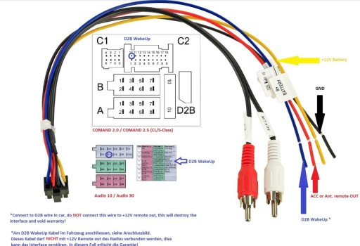 niebieski: +12V przełączane wyjście zdalnego wzmacniacza > D2B Połączenie budzenia