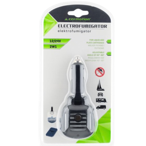 Wtyczka do zapalniczki samochodowej z wbudowanym dyfuzorem elektrycznym do środków odstraszających owady. Nadaje się zarówno do standardowych wkładów, jak i do płynnych środków owadobójczych.