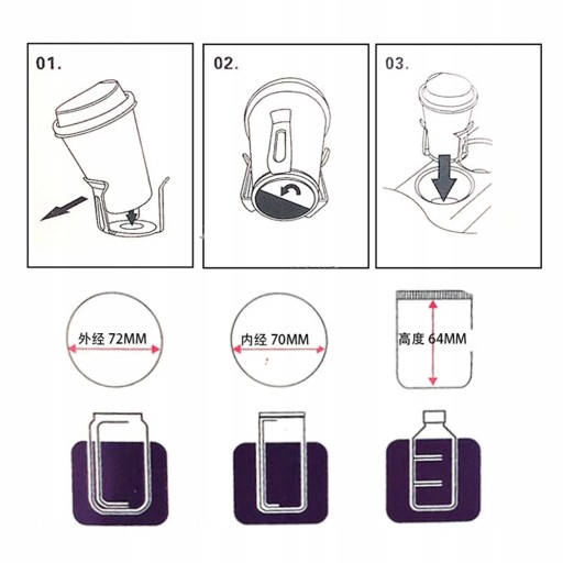Jest to wielofunkcyjny i praktyczny uchwyt na kubek do samochodu. Wykonany z najwyższej jakości materiału, służy do użytku czasowego. Tworzy więcej miejsca na butelkę z wodą do kawy, szklanki i inne drobiazgi, dzięki czemu twój samochód jest czysty i uporządkowany. Rozsądna konstrukcja, łatwa instalacja, nie zajmuje miejsca, jest łatwa w montażu i czyszczeniu. Idealny do użytku samochodowego.