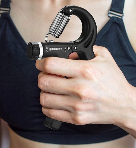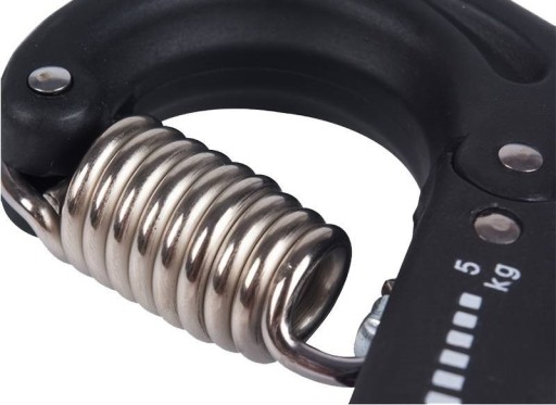 - Ściskacz jest wyposażony w mocną sprężynę, a jego opór można dostosować w zakresie od 5 do 60 kg. To pozwala na stopniowe zwiększanie trudności treningu w miarę postępów.