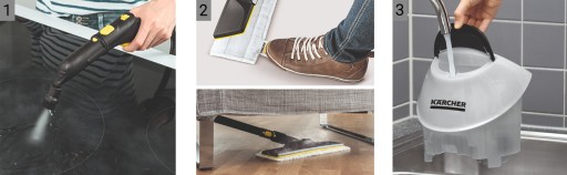 Główna korzyść parownic Kärcher: Dogłębne czyszczenie bez środków czyszczących, tylko wodą kranową, zabija 99,99% bakterii*.