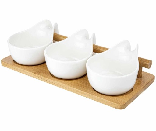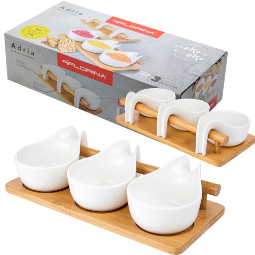 Miseczki do dipów z serii Adria marki Florina zostały wykonane z trwałej porcelany New Bone China. Komplet zawiera 3 miski oraz bambusową podstawkę. Świetnie sprawdzą się na przyjęciach i uroczystościach. Miski mogą być myte w zmywarce. Nie pochłaniają barwników ani zapachów. Posiadają uniwersalne zastosowanie. Ciekawy pomysł na prezent.