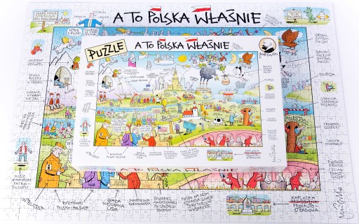 Puzzle 1000 elementów autorstwa Andrzeja Mleczki - A to Polska właśnie Andrzej Mleczko w swoim niepowtarzalnym, humorystycznym stylu przedstawia nasz kraj. Jest miejsce dla słynnych budynków, jak Pałac Kultury i Nauki w Warszawie, najdłuższej polskiej rzeki, pięknych gór, a także zabawnych postaci i dialogów, będących swoistą satyrą na polskie społeczeństwo. Po ułożeniu motyw ten będzie oryginalną ozdobą każdego wnętrza. Puzzle te będą idealne dla każdego wielbiciela rysunków Mleczki.