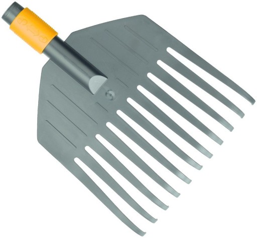 Małe grabie do liści Fiskars QuickFit do grabienia w trudno dostępnych, wąskich miejscach. Grabie wyposażono w 11 miękkich i elastycznych zębów wykonanych z odpornego na wygięcia i pęknięcia tworzywa PBT.