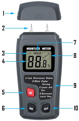 - Czytelny wyświetlacz LCD pokazuje poziom wilgotności drewna w procentach w odniesieniu do wybranego gatunku drzewa!