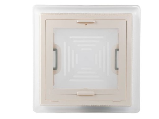 Okno dachowe MPK 46K 40x40 duża pokrywa renomowanej firmy MPK. Okno idealnie nadaje się do zastosowania w przyczepie kempingowej lub kamperze. Okno posiada większą pokrywę górną w stosunku do standardowego okna mpk. Kolor dolnej ramki biały / kremowy (RAL 9001).