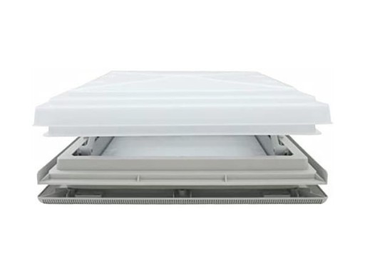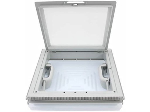 Okno dachowe MPK 40x40 szare z moskitierą. Idealnie nadaje się do zastosowania w przyczepie kempingowej lub kamperze. W razie potrzebny moskitierę można zdemontować.