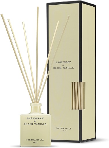 Dyfuzor zapachowy Raspberry & Black Vanilla marki Cereria Molla świetnie nadaje się do wykorzystania w wielu pomieszczeniach np. salonie, łazience czy sypialni.