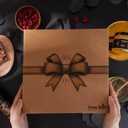 W środku znajdziesz herbatę i kawę marki Green Touch w ozdobnych pudełkach, wyselekcjonowane konfitury (wiśniowa, truskawkowa, malinowa, z cytrynami i pomarańczowa), a także mleczną czekoladę z owocami liofilizowanymi, syrop malinowy premium The Jar oraz drewnianą łyżkę do konfitur. Całość uzupełniają naturalne dekoracje z suszonych plastrów pomarańczy i ekologiczne wypełnienie z kraftowego papieru.