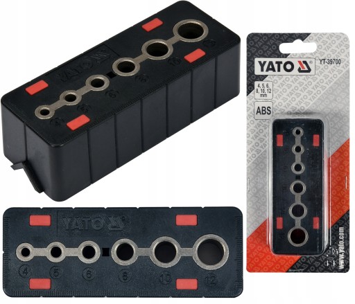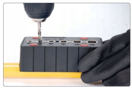 • 5 otworów wyposażonych w prowadnice ze stali węglowej dla wierteł o średnicy 4, 5, 6, 8, 10 i 12 mm
