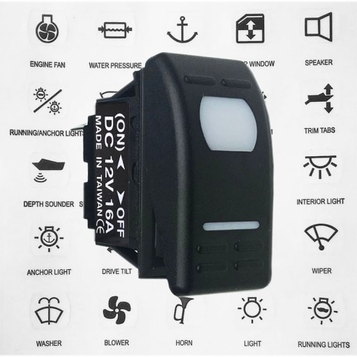 Dwupozycujny, hermetyczny przełącznik (ON)-OFF powracający 3 pinowy z podświetleniem LED. Działa tylko podczas ręcznego przytrzymania w pozycji (ON) w dół. W komplecie naklejki do identyfikacji. W naszej ofercie również kompatybilne ramki do przełączników (kody 04009, 04010, 04011, 04012, 04013).
