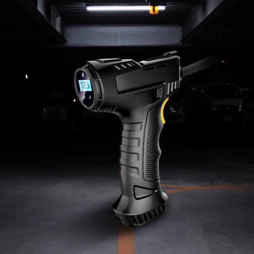 Inflator opon ma cyfrowy wyświetlacz i jasne oświetlenie LED, które może świecić w nocy.