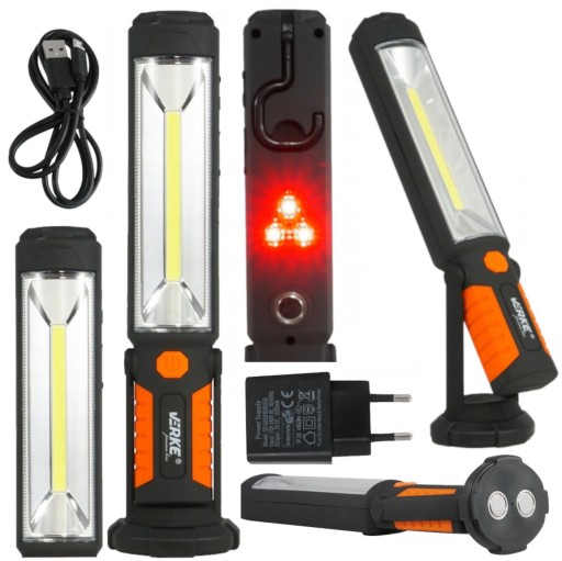 Dzięki zastosowaniu technologii LED latarka daje dużo więcej światła w porównaniu do tradycyjnych a przy tym jest dużo bardziej oszczędna. Poręczna obudowa, urządzenie pewnie leży w dłoni. Duża pojemność akumulatora - 2600mAh zapewnia długą i niezakłóconą pracę. Wbudowane 2 magnesy w podstawie oraz 1 z tyłu lampki czynią latarkę bardzo uniwersalną i komfortową w użytkowaniu. Latarka posiada 3 źródła światła - pasek led cob o mocy 5W, światło punktowe z diodami led u góry oraz trójkąt ostrzegawczy z tyłu lampki. Produkty firmy Verke zasłynęły w Polsce dzięki doskonałej jakości wykonania o autentycznych parametrach.