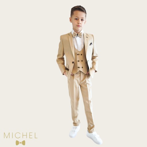 Kamizelka zapinana na 3 guziki z kolei dodaje elegancji, a także umożliwia lepsze dopasowanie garnituru do sylwetki dziecka.