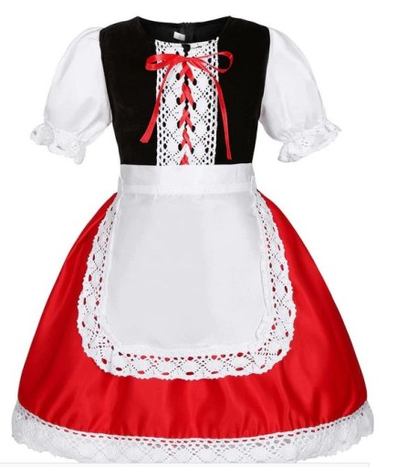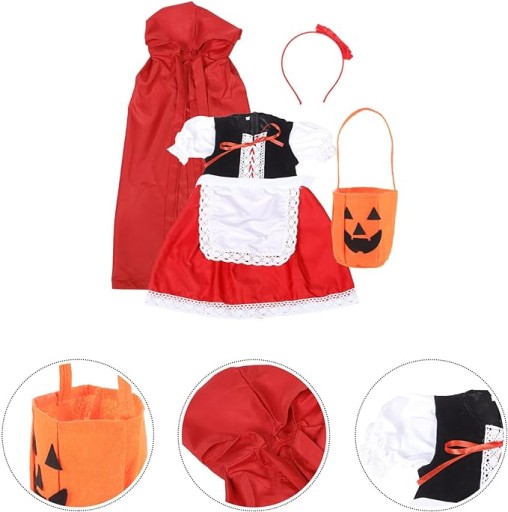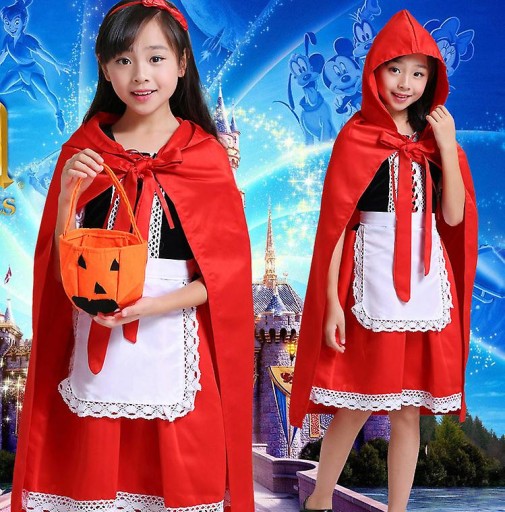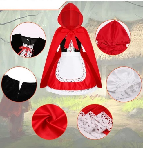 - Zestaw składa się z sukienki, pelerynki, fartuszka ,opaski , podkolanówek i koszyczka na cukierki!