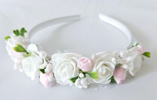 Opaska komunijna przyozdobiona kompozycją kwiatków i listków z perełkami.