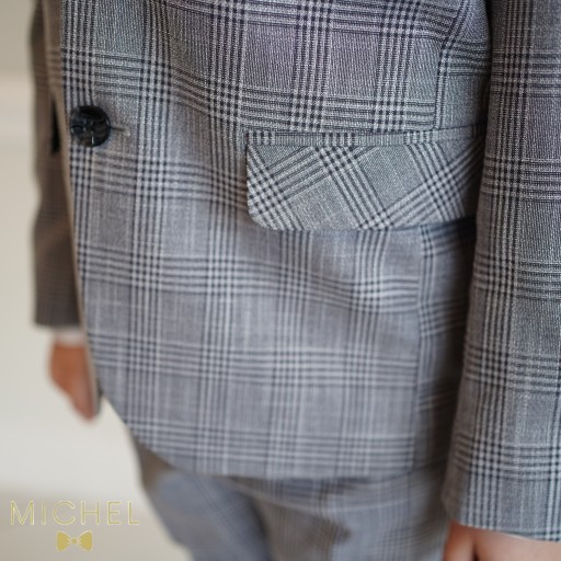 Marynarka klasycznego kroju, zapinana na jeden guzik. Posiada odpowiedni krój, dzięki czemu ubranie dopasowuje się do gabarytu dziecka, a Twoje dziecko odczuwa komfort i wygodę z użytkowania. Tkanina jest przyjemna w dotyku, a przede wszystkim łagodna dla skóry dziecka.