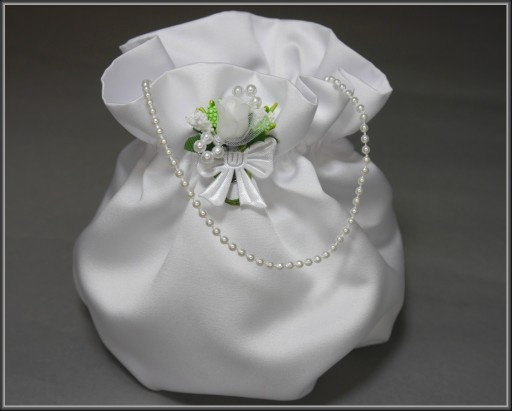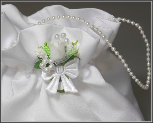 Komplet komunijny w składzie: rękawiczki ozdobione perełkami, okapnik z taśmy satynowej premium i tiulu oraz torebka w kształcie woreczka z satyny ślubnej pierwszego gatunku z perełkowa rączką i ozdobiona przypinką. Torebka posiada wkładkę pomagającą w zachowaniu jej kształtu nawet po wypełnieniu. Do kompletu na naszych pozostałych aukcjach można dokupić pasujący wianek