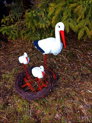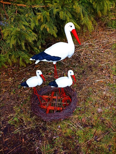 BOCIANIE GNIAZDO - BOCIAN DUŻY Z DWOMA MAŁYMI - FIGURA OGRODOWA OZDOBNA