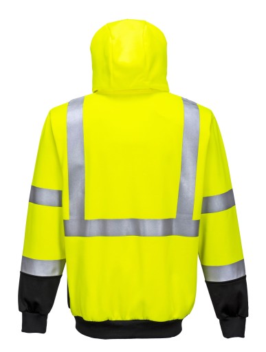 Dwukolorowa bluza ostrzegawcza z kapturem zapinana z przodu na zamek błyskawiczny. Posiada dwie duże kieszenie regulowany kaptur elastyczne wykończenie na dole i na mankietach oraz wgrzaną taśmę ostrzegawczą.