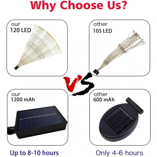 Stopień wodoodporności IP65, słup świetlny wykonany jest z wysokiej jakości stali nierdzewnej i wysokiej jakości tworzywa sztucznego, może wytrzymać wszelkiego rodzaju warunki pogodowe, w tym ulewny deszcz i śnieg, bez obawy o rdzę i blaknięcie. Dekoracja zewnętrzna i wysokiej jakości słoneczne światła fajerwerków LED migają jasno, są trwałe, przyjazne dla środowiska, niezawodne i odporne na korozję.