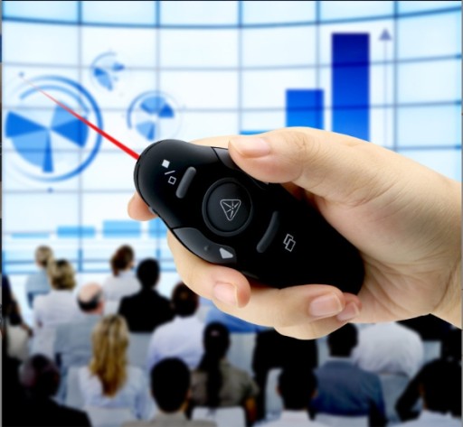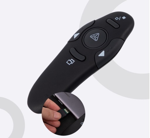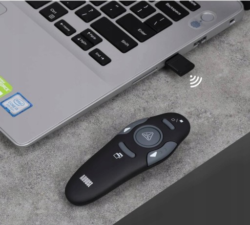Bezprzewodowy prezenter laserowy wyposażony jest w specjalny nadajnik, który podłączamy do komputera za pomocą portu USB. Dzięki temu narzędziu możemy kontrolować przebieg prezentacji, zmieniać slajdy, włączać filmy czy pokazywać zdjęcia.