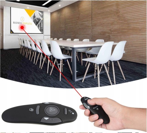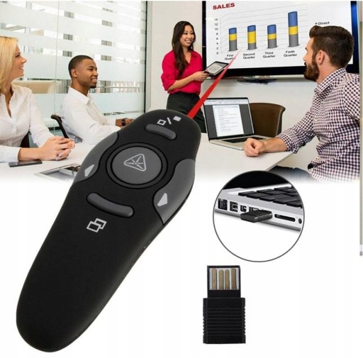 Bezprzewodowy prezenter laserowy wyposażony jest w specjalny nadajnik, który podłączamy do komputera za pomocą portu USB. Dzięki temu narzędziu możemy kontrolować przebieg prezentacji, zmieniać slajdy, włączać filmy czy pokazywać zdjęcia.