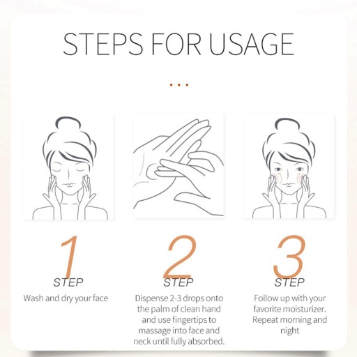 Dispense2-3 krople na dłoń czystej dłoni i użyj palców do masażu twarzy i szyi, aż do całkowitego wchłonięcia.
