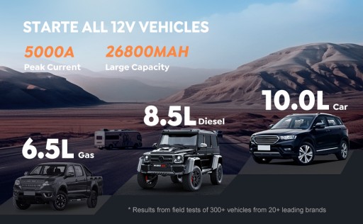 【URUCHOM CAŁKOWICIE WYŁADOWANE AKUMULATORY】 Wydajny i bezpieczny, natychmiastowe zasilacze samochodowe lub niskonapięciowe. Rozrusznik samochodowy o natężeniu prądu rozruchowego 5000 A, szczególnie do wszystkich przedstawicieli benzynowych/10,0 l diesla, nawet w temperaturze -4 ~ 140 ℉. Przez około 24-miesięczne czasowi czuwania i ponad 1000 cyklom ładowania, urządzenie do awaryjnego uruchomienia elektrycznego jest zawsze gotowe do pomocy.
