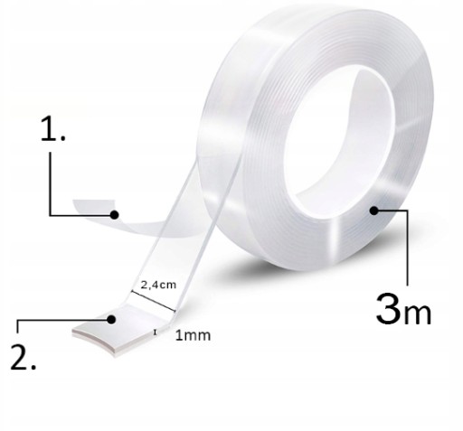 - Grubość taśmy: 1mm - dyskretna, nie zmieniająca znacząco profilu przyklejanych przedmiotów.