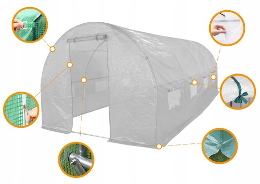 Tunel wykonany jest z folii PE z filtrem UV-4 dzięki czemu jest wyjątkowo odporny na warunki atmosferyczne przez co doskonale izoluje uprawy. Pozwala przedłużyć sezon wegetatywny roślin poprzez panujący w nim, idealny mikroklimat. Umożliwia uprawę roślin ciepłolubnych, takich jak ogórek, papryka, pomidor, bakłażan itp., pozwala także przyspieszyć uprawę warzyw kapustnych, liściowych, roślin ozdobnych oraz produkcję rozsady. Konstrukcja naszego tunelu foliowego wykonana została z ocynkowanych profili stalowych, jest bardzo wytrzymała, stabilna oraz odporna na korozję. Wentylację zapewniają okna z moskitierami, dodatkowo chroniąc uprawy przed insektami.