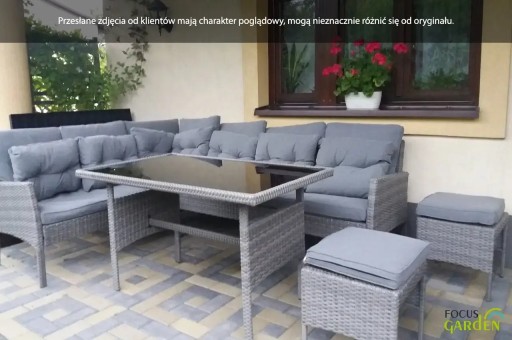 W skład kompletu wchodzą: 2 sofy narożne, 2 pufy oraz duży, prostokątny stół obiadowy. Każdy element został starannie wykonany z ponadprzeciętnie wytrzymałej plecionki z technorattanu w eleganckim odcieniu brązu, co gwarantuje nie tylko trwałość, ale także odporność na warunki atmosferyczne.