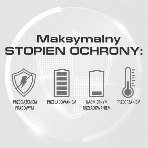 Wielopoziomowa ochrona przed: przeciążeniem prądu, przeładowaniem, nadmiernym rozładowaniem, przegrzaniem.