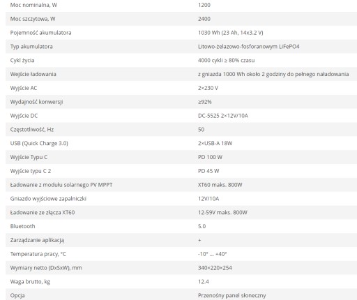 Przenośna stacja zasilania KS 1200PS, moc znamionowa 1200 W, moc szczytowa 2400 W, akumulator 1030 Wh (23 Ah, 14x3,2 V), LifePO4, 2×230 V 50 Hz, 2 x USB-A Quick Charge 3.0 18 W, 1 x USB Typ-C PD100 W, 1 x USB Typ-C PD45 W, 2xAC, 2xDC 12V/10A, wyświetlacz LED