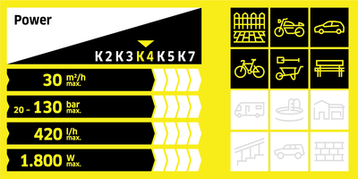 - Kärcher - wyższe ciśnienie robocze oraz wydatek wody, idealnie dobrane dysze do klasy urządzenia pozwalają uzyskać najlepszy efekt czyszczenia powierzchni płaskich.