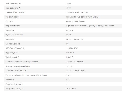 Przenośna stacja zasilania KS 2400PS, moc znamionowa 2400 W, moc szczytowa 4800 W, akumulator 2240 Wh (50 Ah, 14x3,2 V), LifePO4, 4×230 V 50 Hz, 2 x USB-A Quick Charge 3.0 18 W, 1 x USB Typ-C PD100 W, 1 x USB Typ-C PD45 W, 4xAC, 2xDC 12V/10A, wyświetlacz LED