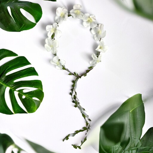Dodatkowo został ozdobiony listkami oraz wstążkami, które zwisają ozdobnie z tyłu głowy. Pięknie prezentować będą się na włosach.